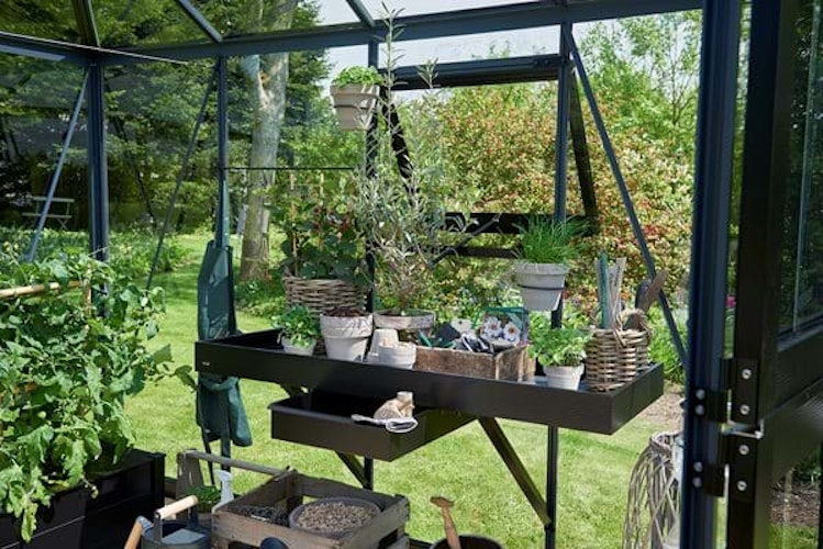 Die integrierten Gewächshaustische von Juliana bieten eine funktionelle Arbeitsfläche, die nicht zu viel Platz einnimmt. An der Unterseite des Tisches befindet sich eine Schublade zur Aufbewahrung von Werkzeug, Samen etc. Das schicke Design harmoniert gut mit den neuen Gewächshausserien von Juliana.