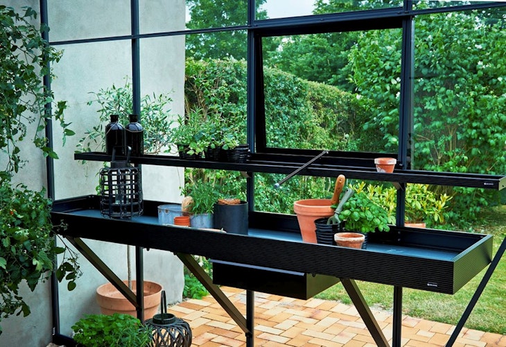 Die integrierten Gewächshaustische von Juliana bieten eine funktionelle Arbeitsfläche, die nicht zu viel Platz einnimmt. An der Unterseite des Tisches befindet sich eine Schublade zur Aufbewahrung von Werkzeug, Samen etc. Das schicke Design harmoniert gut mit den neuen Gewächshausserien von Juliana.