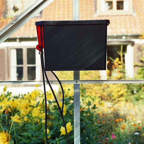 Das Bewässerungssystem wird an einen Gartenschlauch angeschlossen und befüllt sich automatisch. Ist der max. Füllstand erreicht, stoppt die Befüllung automatisch. Der Schlauch wird ähnlich einer Fußbodenheizung auf dem Gewächshausboden verlegt und die enthaltenen Bewässerungsröhrchen werden in die Erde gedrückt. Über diese Röhrchen erfolgt die Bewässerung.