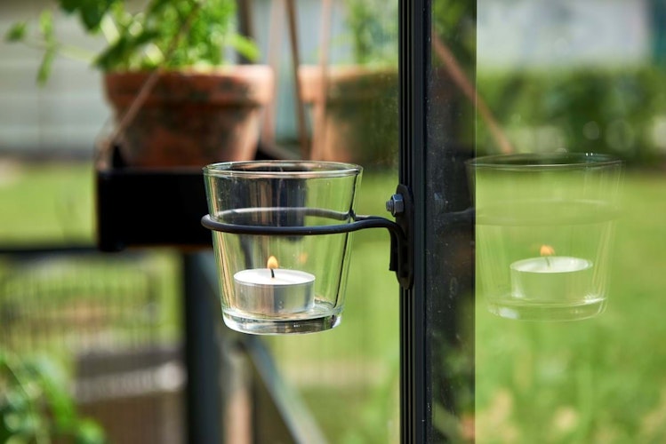 Mit dem Teelicht im Gewächshaus können Sie in den späten Stunden eine warme Atmosphäre schaffen, wenn das Gewächshaus als Aufenthaltsraum benutzt wird. Wenn Sie den Halter in die Profile anbringen, können Sie auch die Höhe des Gewächshauses ausnutzen.