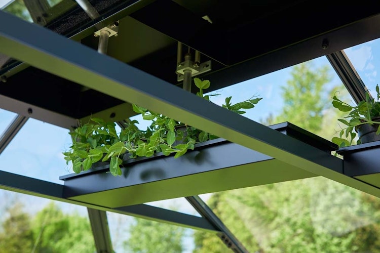 Das Juliana Gipfel-Regal ist für das Anbauen in der Höhe hergestellt. Das Regal kann in allen Juliana Gewächshäusern mit Kehlbalken montiert werden. Auf die Art und Weise können Sie Ihr Gewächshaus voll ausnutzen, selbst in der Höhe. Das Regal misst 718 x 172 x 60 mm und das Material ist aus schwarzem pulverlackierten, galvanisiertem Stahl. Das Regal ist so konstruiert, dass die Pflanzen von unten bewässert werden können. Das Regal ist praktisch, weil es einfacher ist Stecklinge, Gewürzkräuter u.ä. unter idealen Bedingungen zu platzieren.